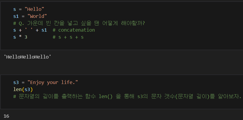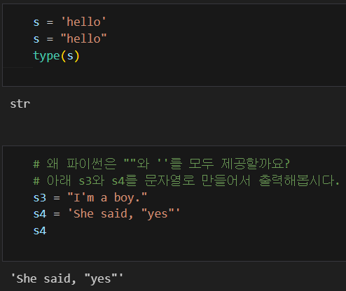 * 파이썬에서 '와 " 두 가지의 기호를 통해 문자열을 나타낸다. 즉, '부터 '까지 또는 "부터 "까지 하나의 문자열이다. e.g. 'Hello', "World"