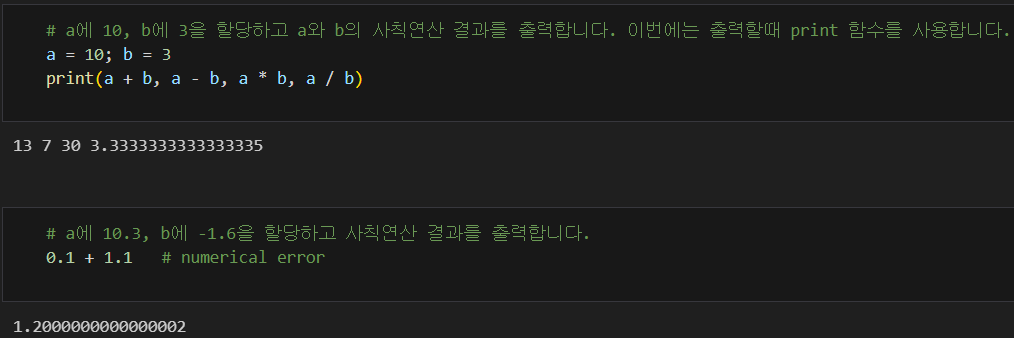 * 숫자 데이터는 우리가 알고 있는 대부분의 연산을 그대로 지원한다. 사칙연산(+-*/), 나머지 구하기(%), 몫 구하기(//), 거듭제곱(**) 등