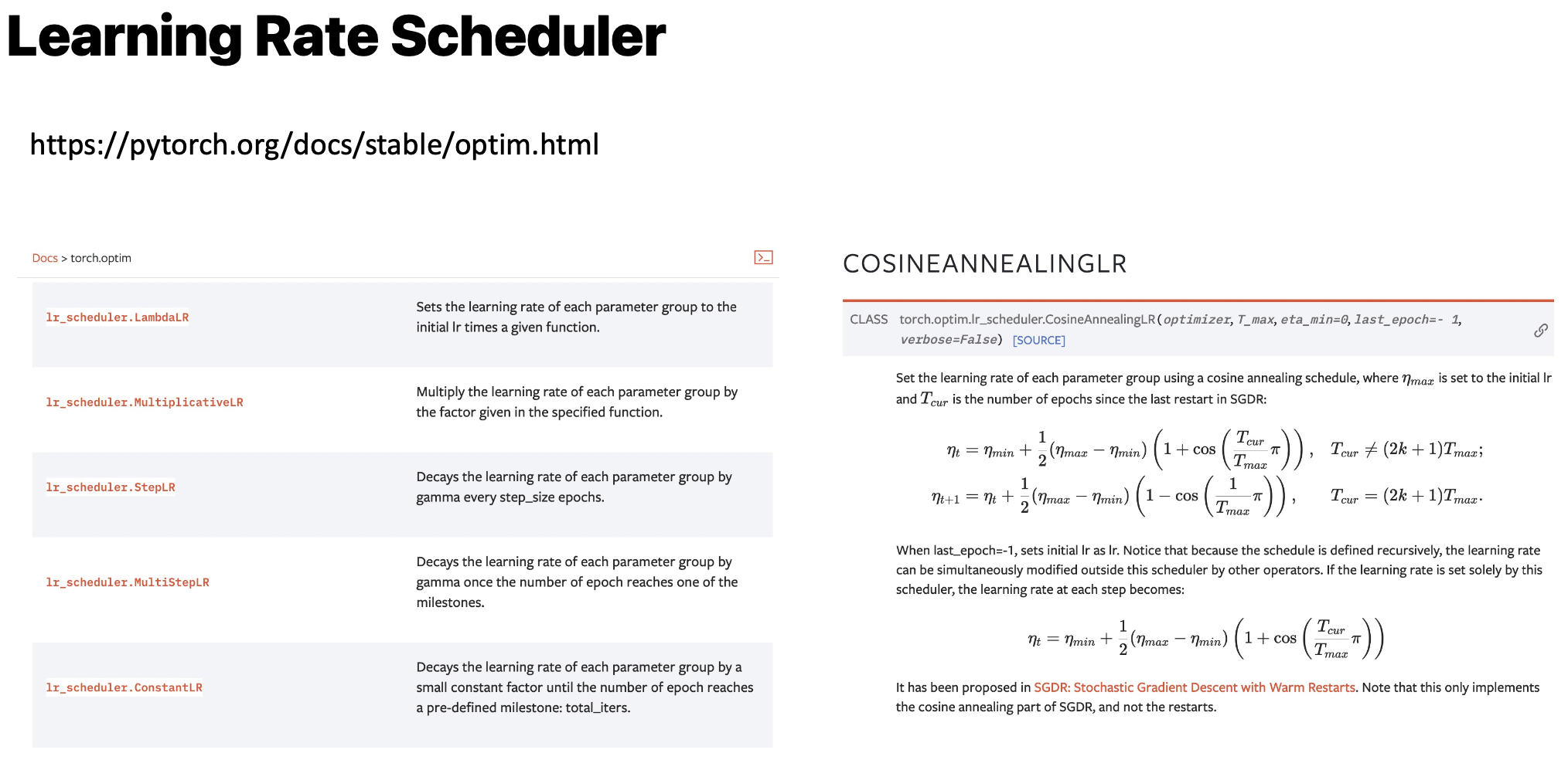 - 여러가지 learning rate scheduler는 위 페이지에 들어가면 각각에 대해 사용법까지 자세히 나와있어 직접 만들 필요없이 가져다가 쓰면 된다.