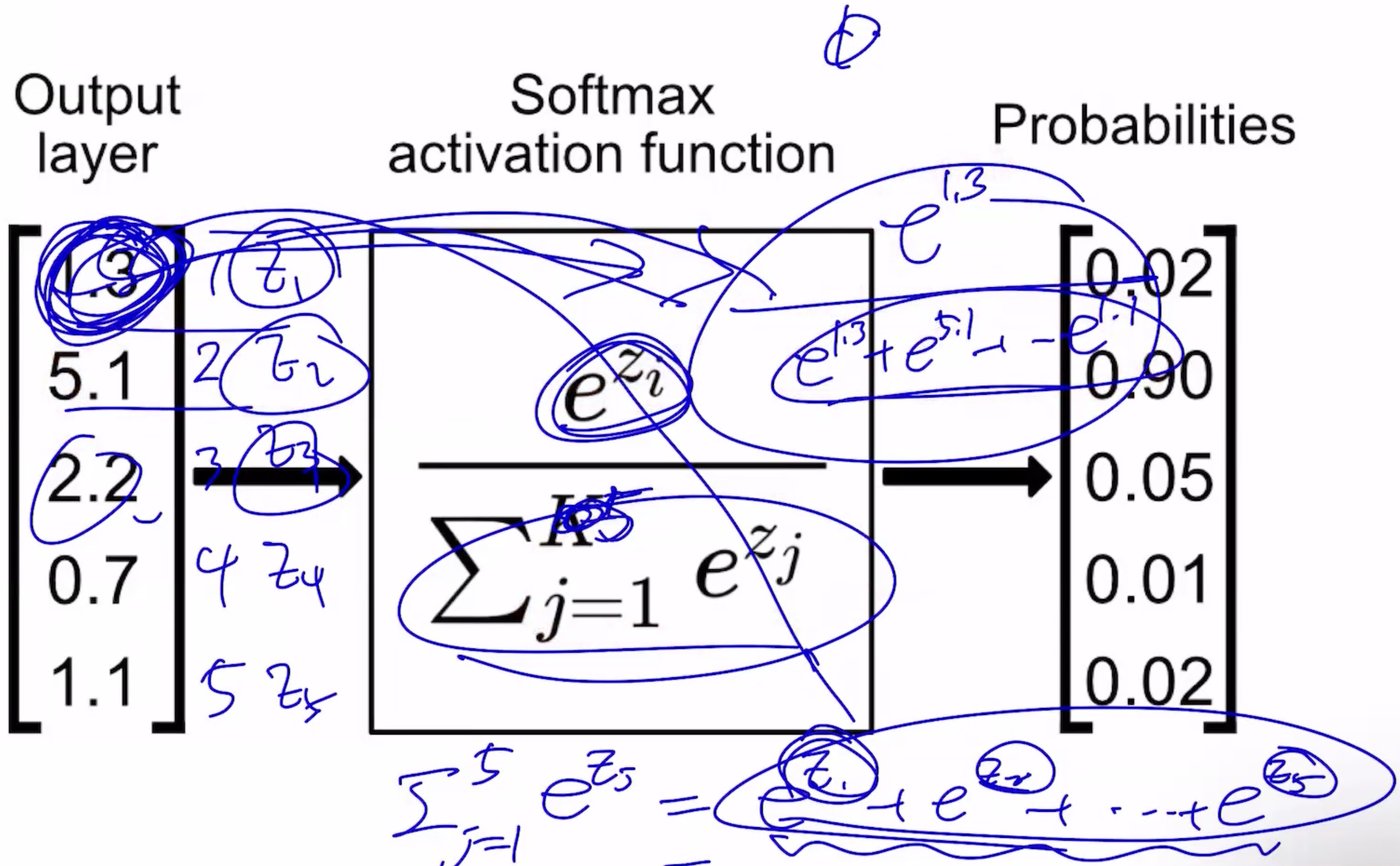 - 그래서 Softmax를 쓴다. Softmax function을 쓴다는 것은 클래스가 두개보다 많은 여러개인 상황을 말하며, 클래스가 2개일때는 바이너리로 풀 수 있으면 Sigmoid function을 쓰면 된다. Softmax function 작동방식은 아래 그림에서 k=5라 할때, exponential에 각각의 output값을 넣어서 해당 output의 exponential의 값 / exponential 총합을 각각 계산하는것이다. softmax의 큰 장점중에 하나는 모두 더했을때 값이 항상 1이 된다. 따라서 이렇게 값이 나오면 일종의 확률값으로 생각할 수 있다. 변환된 값으로 confidence를 가지고 예측을 하는거라고 해석이 가능하다.