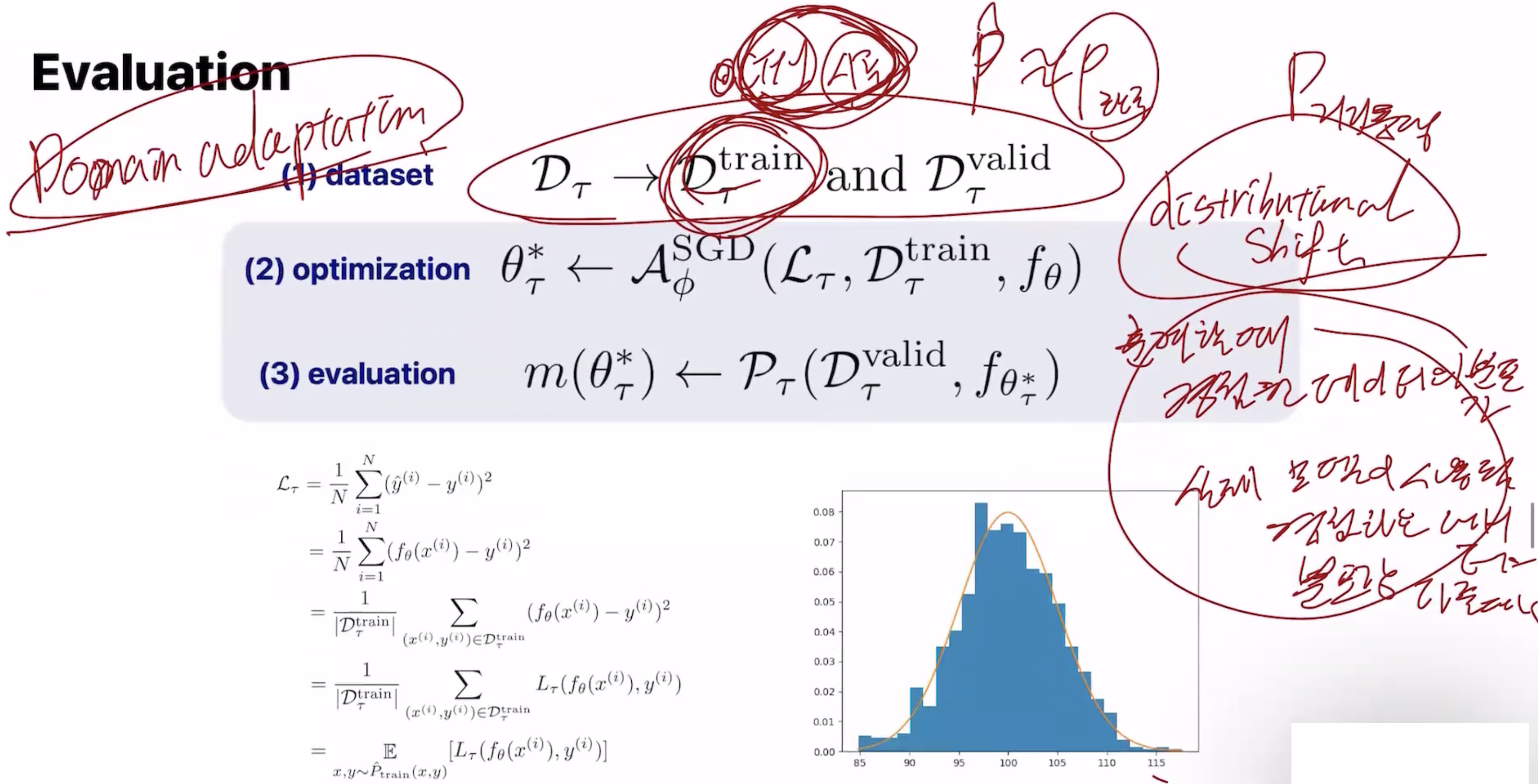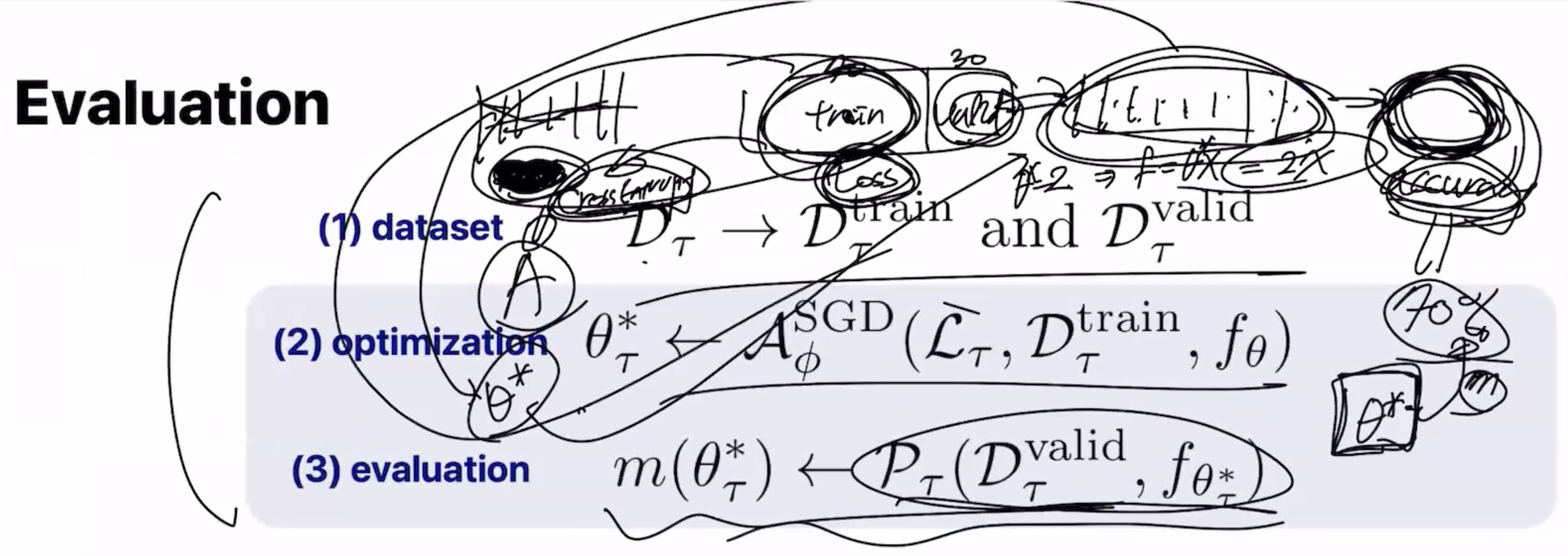 - 훈련용 데이터셋을 train과 valid로 나뉜다. 훈련은 train으로 하되 모델이 얼마나 잘하고 있는지에 대한 평가는 valid로 진행한다. 그 다음에는 최적화를 진행한다. 최적화는 SGD 알고리즘으로 최적의 세타를 찾는다. 이때 파이는 하이퍼파라미터를 말한다. 그 알고리즘에 로스, 훈련용 데이터, 모델을 넣는다. evaluation(평가)에서 P는 Performance metric을 계산하는 과정의 함수이며 최적의 파라미터와 valid 데이터를 넣어서 성능이 얼마나 나오는지를 보고, 특정 파라미터에 대한 성능수치를 보겠다는 것이다. 따라서, evaluation은 하이퍼파라미터 튜닝까지 이어지기 위한 일련의 과정이다.