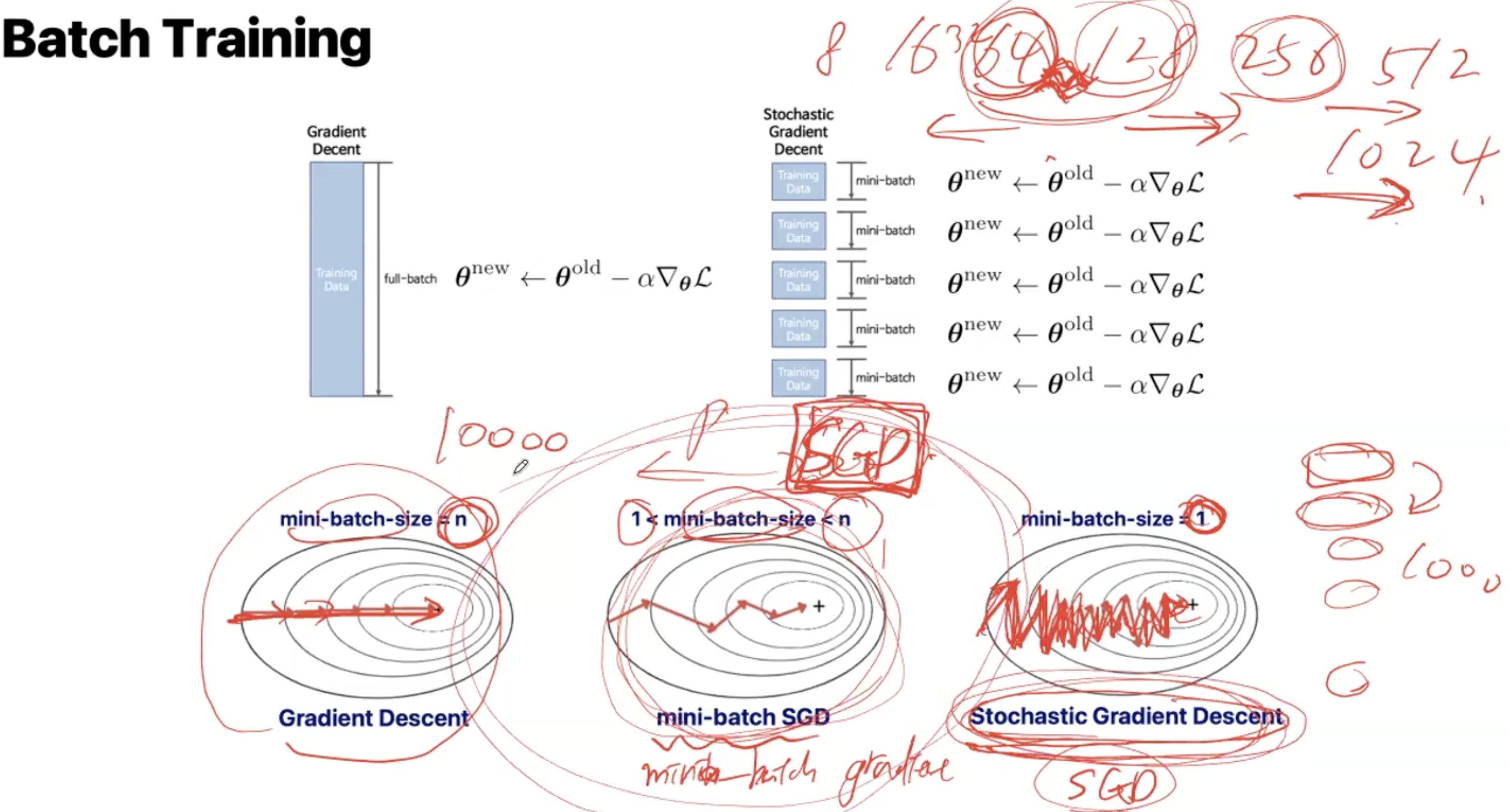 - 반면에 데이터 하나가지고 gredient계산하면서 업데이트 하게 되면(예를들어, 전체 데이터가 10000개일때 1개씩 뽑아서 파라미터를 업데이트를 10000번씩 하게 되면) 당연히 한번 업데이트할 때 하는 업데이트가 최선의 방향으로 가기보다는 이상한 방향으로 많이 빠진다. 그런 식으로 하면 업데이트가 계속 왔다갔다 하면서 실제로 훈련할때 우리 목표로하는 지점에 도달할때까지 많은 시간이 걸리게 된다. (mini-batch-size=1인 경우)