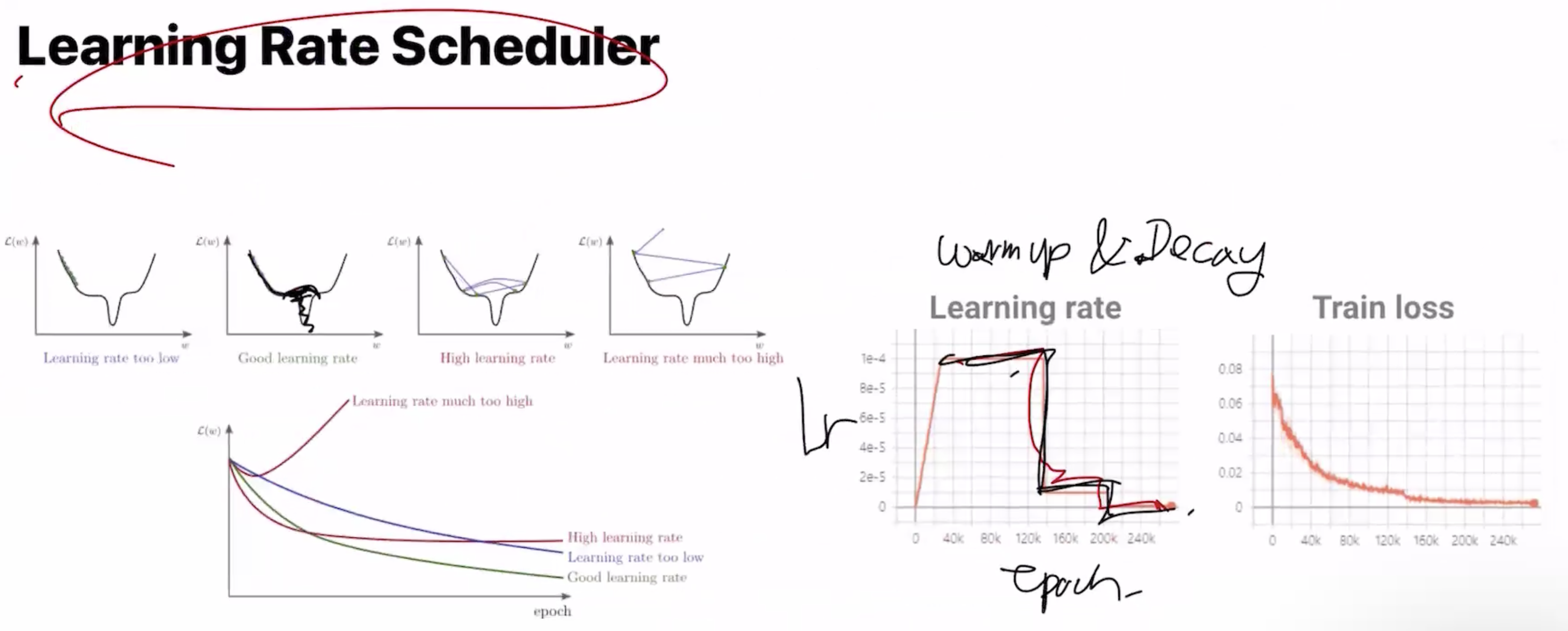 - 따라서, learning rate scheduler를 정한다. learning rate가 언제 좋은지 잘 모르기때문에 이쯤에는 learning rate를 이 값을 사용하도록 나름대로 스케줄을 정해주는 것이다. 따라서, 임의로 정해주는것이라 정답이 없기에 많은 경험으로 이런거에 대한 감이 많이 발전한다.