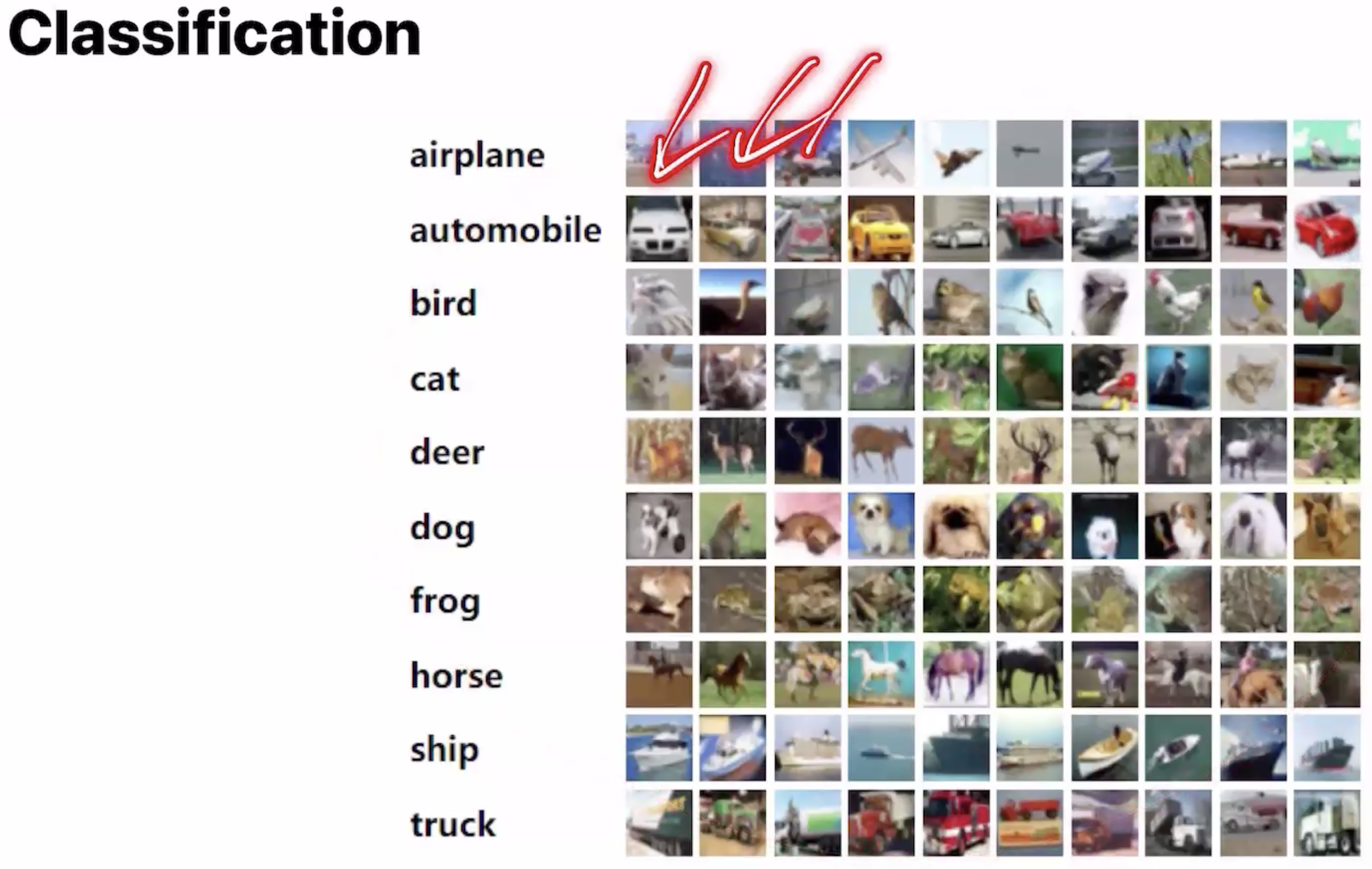 - 분류는 아래그림처럼 임의의 이미지가 주어졌을때 이것을 비행기인지 자동차인지 새인지 고양이인지 판단하는 것이다.