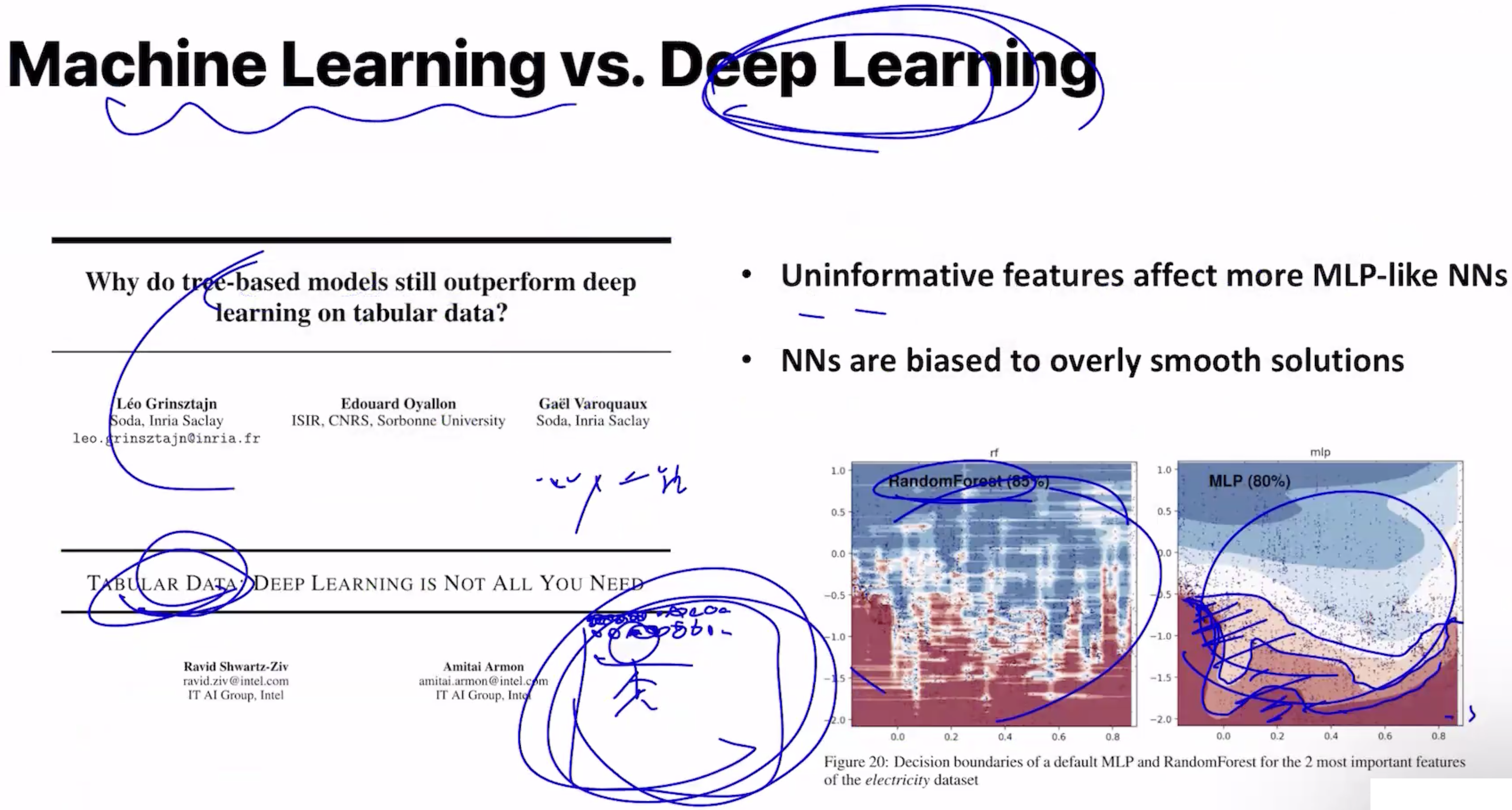 - 그럼 딥러닝 모델이 무조건 좋은가? No. 머신러닝 모델이 딥러닝보다 잘하는 부분중에 하나가 tabular data 즉 테이블 형태로 주어져서 하나하나가 feature로 된 데이터에서 이다. 잘하는 이유중 첫번째로 각 인공지능 입장에서는 이런 tabular data를 그냥 input으로 넣을때 필요가 없는 정보가 있으면 MLP같은 모델들은 불필요한 feature에 조금 더 취약하다. 아무래도 모델 Capacity가 높은것도 영향이 있는 반면에 tree-based 모델같은 머신러닝에서는 그런 부분들에 영향을 덜 받는 방식으로 작동한다.