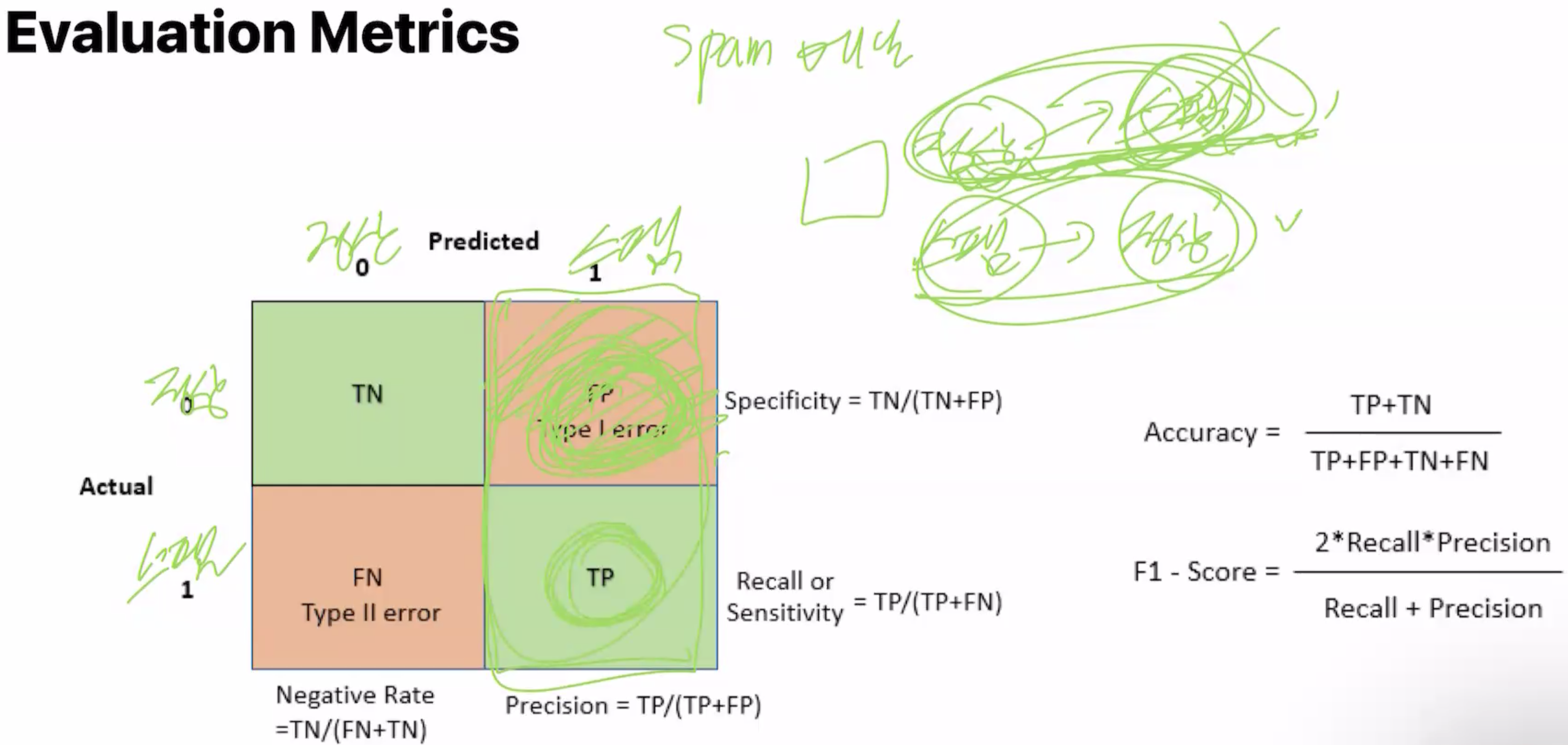 - 스펨메일 예시에서는 정상메일을 스팸처리하는 경우와 스팸메일을 정상처리하는 경우가 있을때 정상메일을 스팸처리하는 경우가 곤란하기때문에 이 상황은 피하고 싶은 상황이다. 모델이 Positive(스팸)이라고 주장하나 실제는 False인 경우를 말하며 이것을 False Positive(FP)라 한다. 이때 측정하는 것이 Precision이며 FP가 높을수록/낮을수록 Precision은 낮아진다/높아진다.