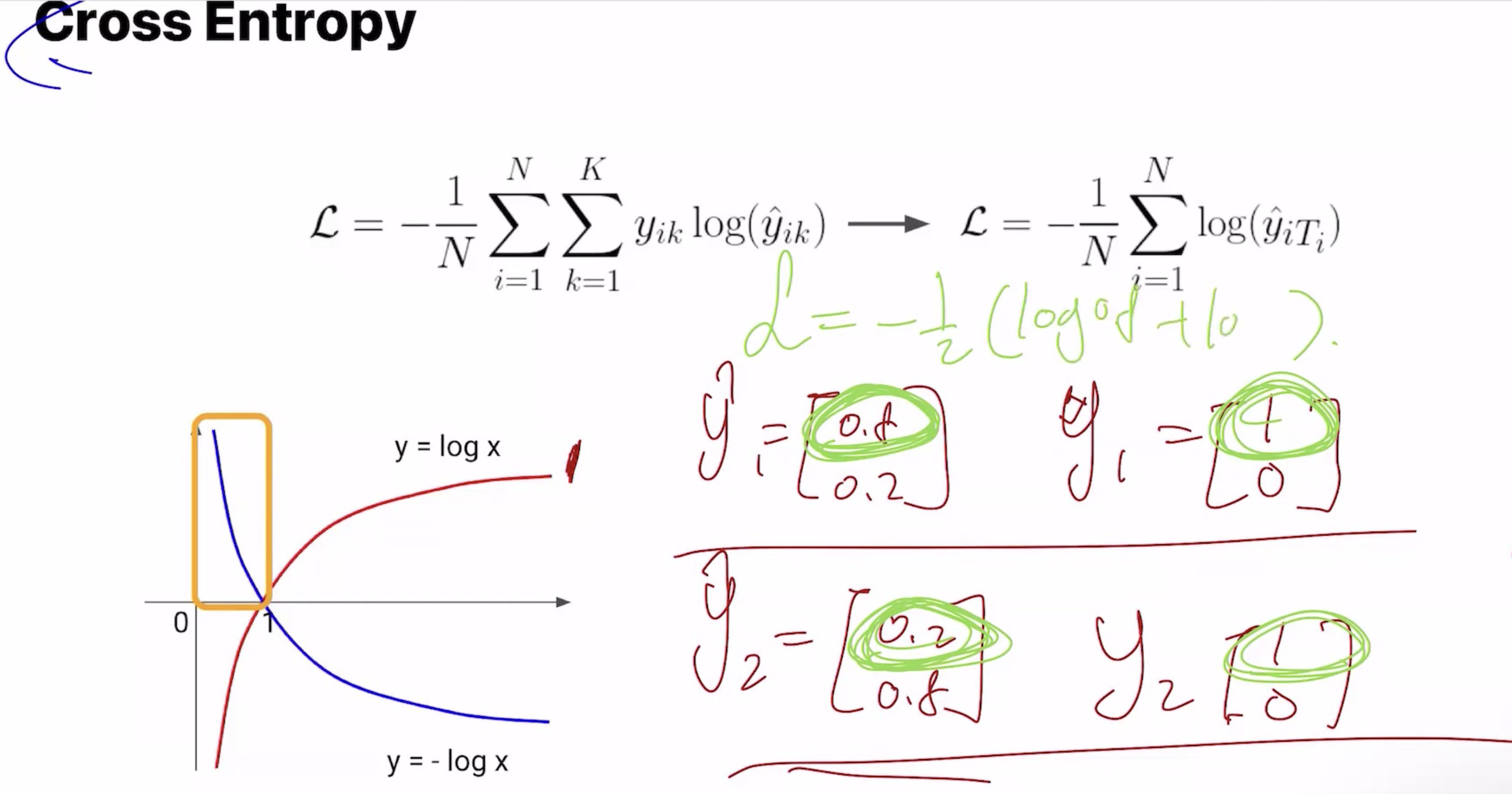 - yik에서 정답은 1인 수만 곱셈하게되면 생략이 된 모양이며, 정리된 식에서 Ti는 i번째 샘플의 정답라벨 번호이다. 아래와 같이 계산하게되면 중요한 포인트는 실제로 Cross Entorpy에게 쓰이는것은 정답인것의 Softmax 값이 된다. 중요한 두번째 포인트는 로그를 한 이유이다. y^에 1이 들어갈수록 1이 들어간다는것은 정답라벨에 가까울수록 로그값은 0에 가까이 가게 된다. 로그를 할때 장점은 정답라벨에 대한 컨피던스를 높게 해줄수록 로스가 낮아지고(0에 가까워지고) 정답에 대한 컨피던스 softmax out값을 낮게 해줄수록 로스는 무한대로 계속 높아진다. 이것이 Cross Entropy의 작동원리이다.