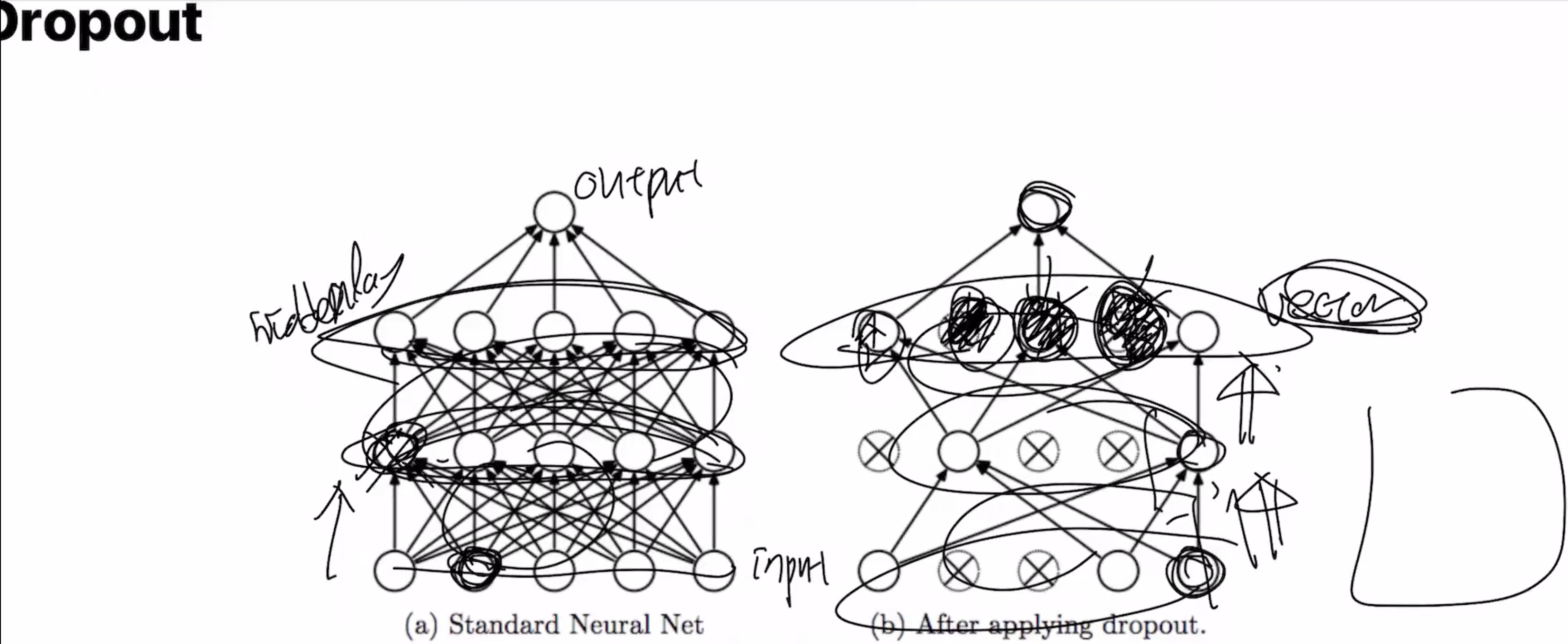 - hidden을 dropout하여 나온 결과물이나 이런 중간과정 없이 나온 결과물이 같은 퍼포먼스를 보이기 기대하는 것이다. 트레인 과정에서는 dropout를 하지만 테스트 과정에서는 dropout적용을 안한다. 다만 히든에 p를 곱하는 새로운 것이 필요하다. p를 곱하는 이유는 dropout을 하게되면 일부 노드들의 크기가 0이되어 전체적인 벡터의 크기(magnitude)가 줄어들기에 스케일을 맞춰주기위해 날려주기 위해서이다.