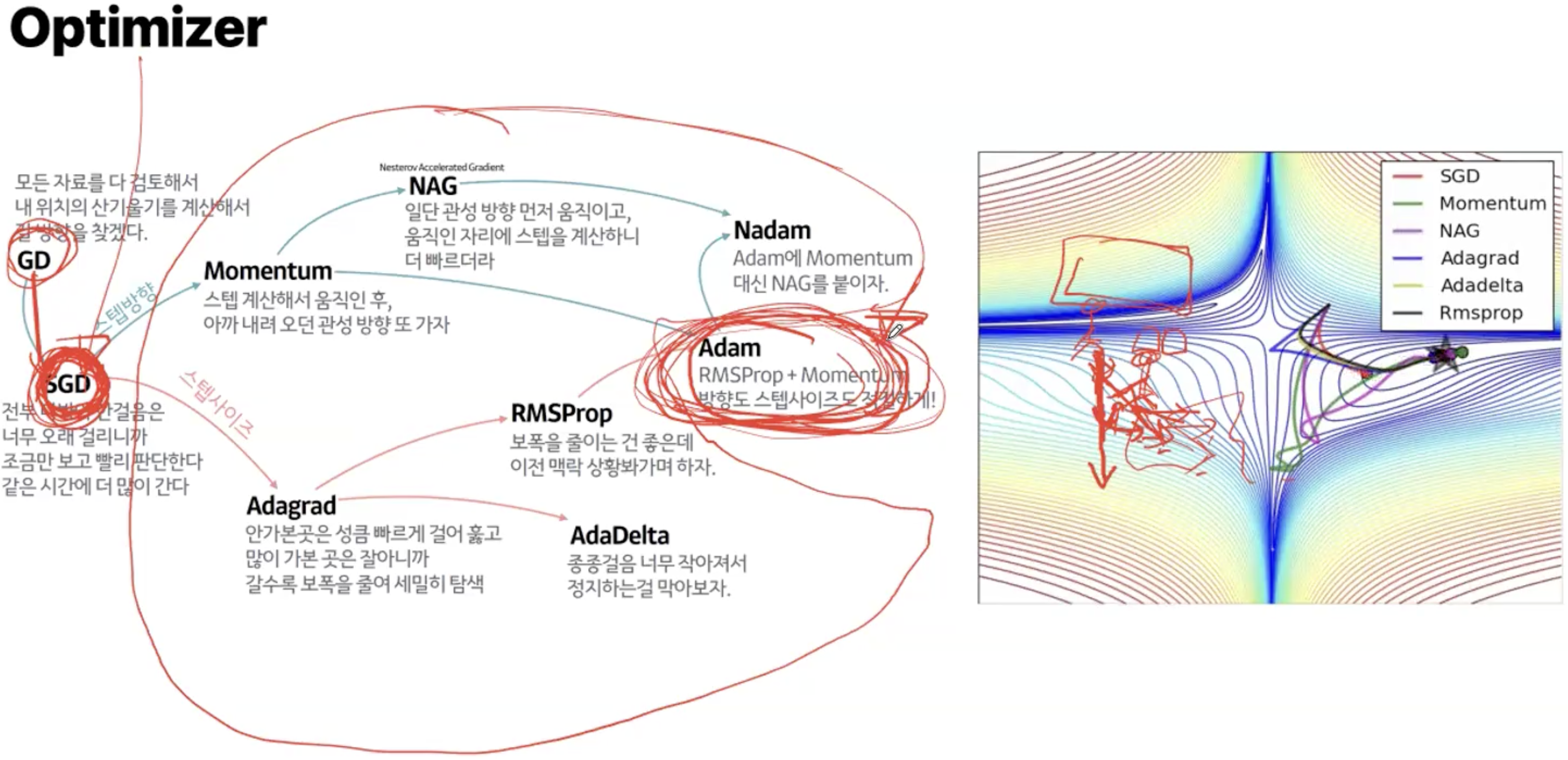 - Optimizer도 결국 Gradient를 어떻게 계산하느냐와 이 Gradient를 계산해서 파라미터를 어떻게 업데이트하냐라는 방법이고, 그것을 할 수 있는것에 대해 다양한 옵셥이 있는데 일단은 아담을 쓰면 처음 선택지로써는 괜찮은 선택지이다.