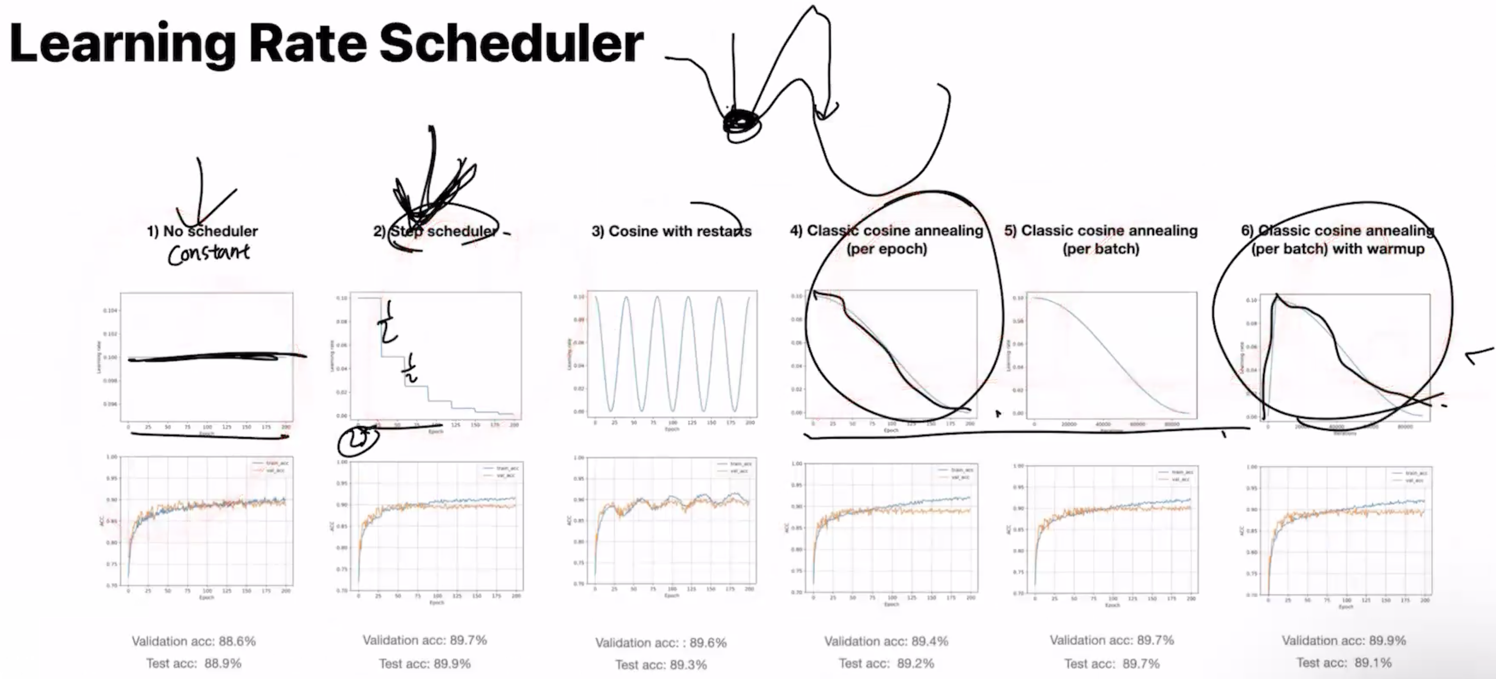 - 위 그림은 규칙으로 일정하거나 그렇지않은 epoch마다 learning rate을 줄여나가는 그래프이며 1번은 learning rate가 constant한 모양이고, 2번은 25 epoch마다 learning rate를 1/2씩 줄여나가는 step모양이다. 가장 많이 사용되는 Scheduler은 1,2,4,5,6번 모양이며 그 중 2번이 가장 빈번하게 이용되기에 처음에 시작할때 사용해보는것이 좋다.