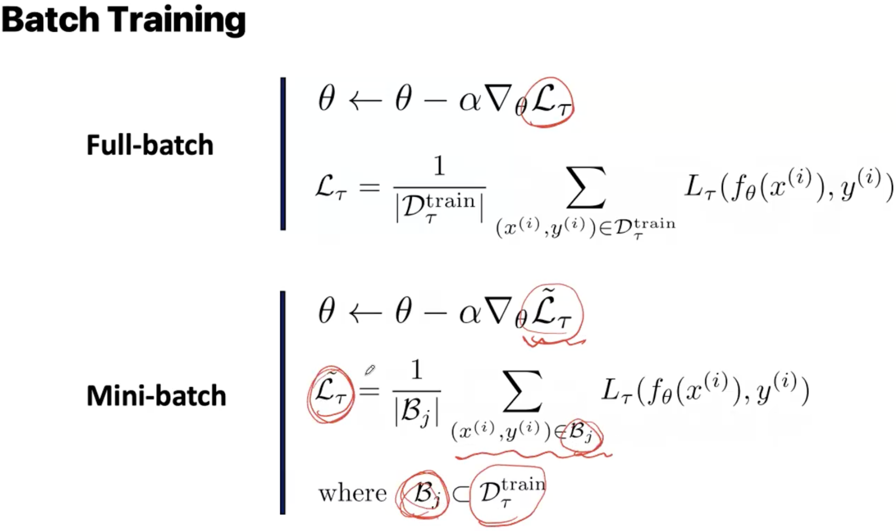 - 수식으로 비교하면 다음과 같다. 로스가 근사할때 데이터셋 전체를 쓰는게 아니라 데이터의 부분집합으로써 어떤 batch 데이터셋 하나를 뽑아서 그 batch 데이터셋을 가지고 로스를 계산하는 것이 차이점이다.