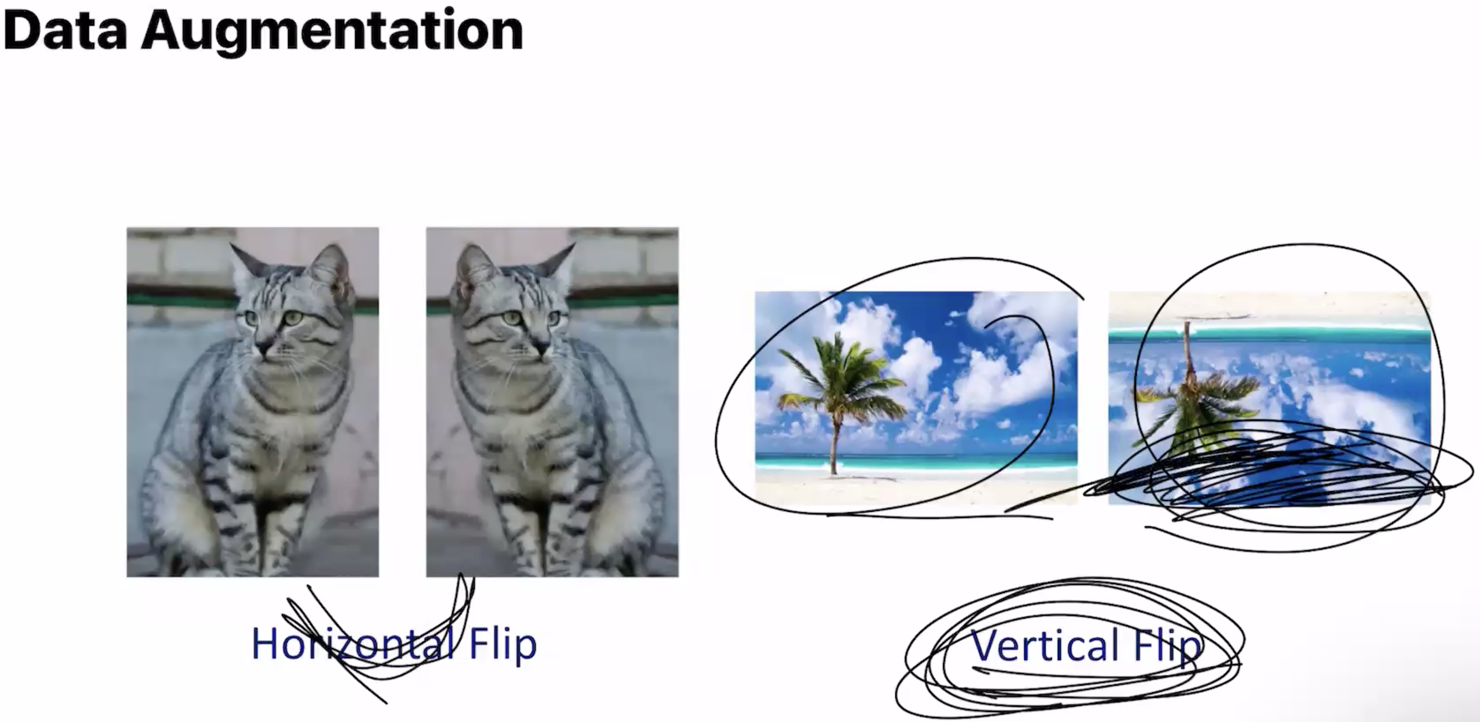 - 좌우반전 혹은 왼쪽 그리고 오른쪽으로 구분이 되어야 하는게 아니면 Horizontal Flip, 위 아래가 바뀌는거면 Vertical Flip이라 한다. 하지만 위 아래 바뀌는것은 함부로 쓰면 문제가 발생한다. 해당그림에서는 하늘이 밑으로 가는 경우는 없기에 현실에서 이러한 분포를 배우는것은 보통 악영향을 많이 미칠수도 있으니 적절하게 쓰면 된다.