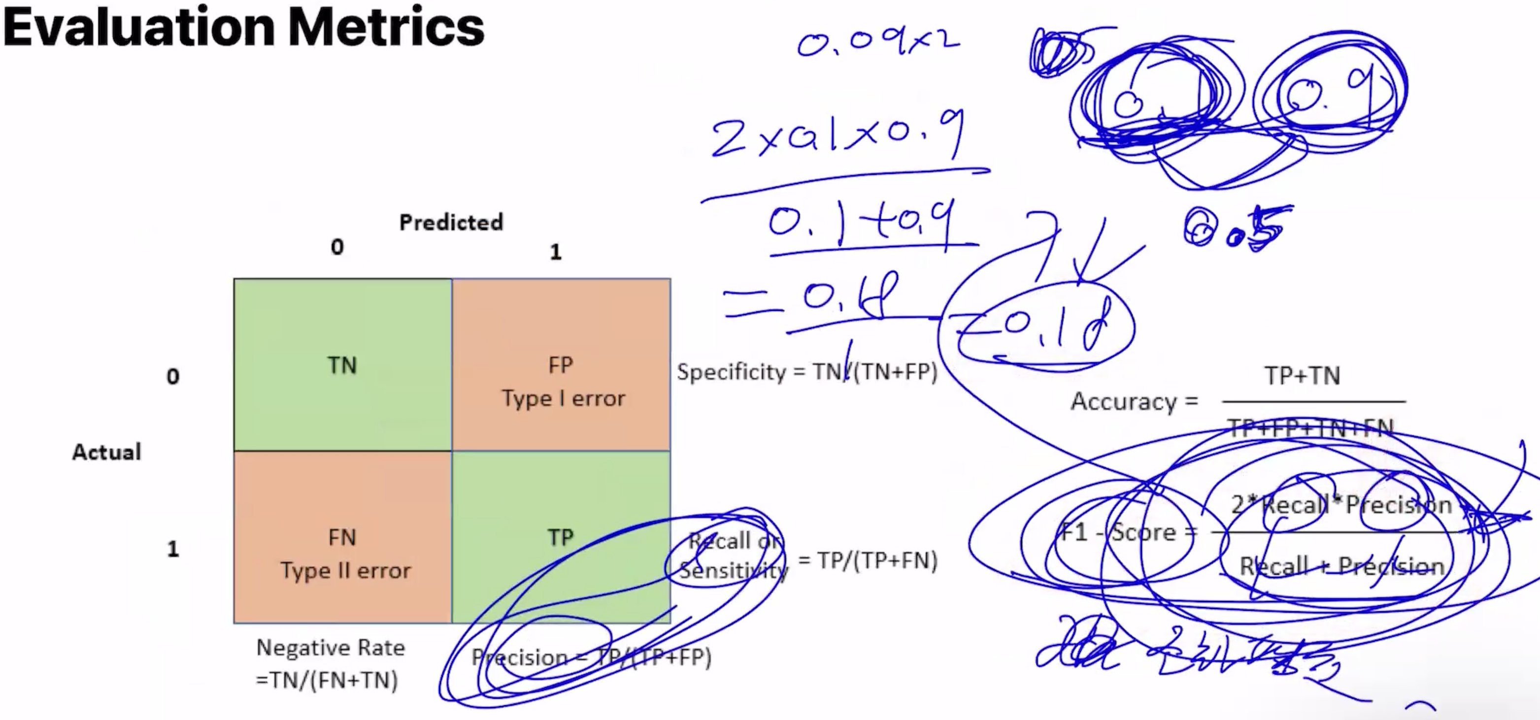 - 이러한 여러가지 맥락을 고려하여 Evaluation Metrics를 잘 설정해야하고 이러한 Metric은 미분을 할 수 없기때문에 실제 훈련할때는 Cross Entropy를 가지고 훈련한다. F1 score는 조화평균이라고도 하는데 취지는 recall과 precision 둘다 잘 측정하려고 하는데 두개의 값 중에 하나가 너무 낮으면 낮은값에 대해서 굉장히 예민하게 작동을 한다. 따라서, F1 score가 하고 싶은것은 recall과 precision 둘 다 잘 고려해서 어느것 하나 못하는 것을 잘 캐치하고 싶은데 단순 평균을 내버리면 한쪽은 잘하고 다른한쪽은 못하는 건 사실 안좋은 상황인데도 불구하고 이것을 고려를 못하게 되는데 조화평균을 하게되면 이 두가지 모두 골고루 잘 고려할 수 있게 낮은 값을 민감하게 반응할 수 있다는 장점이 있다.