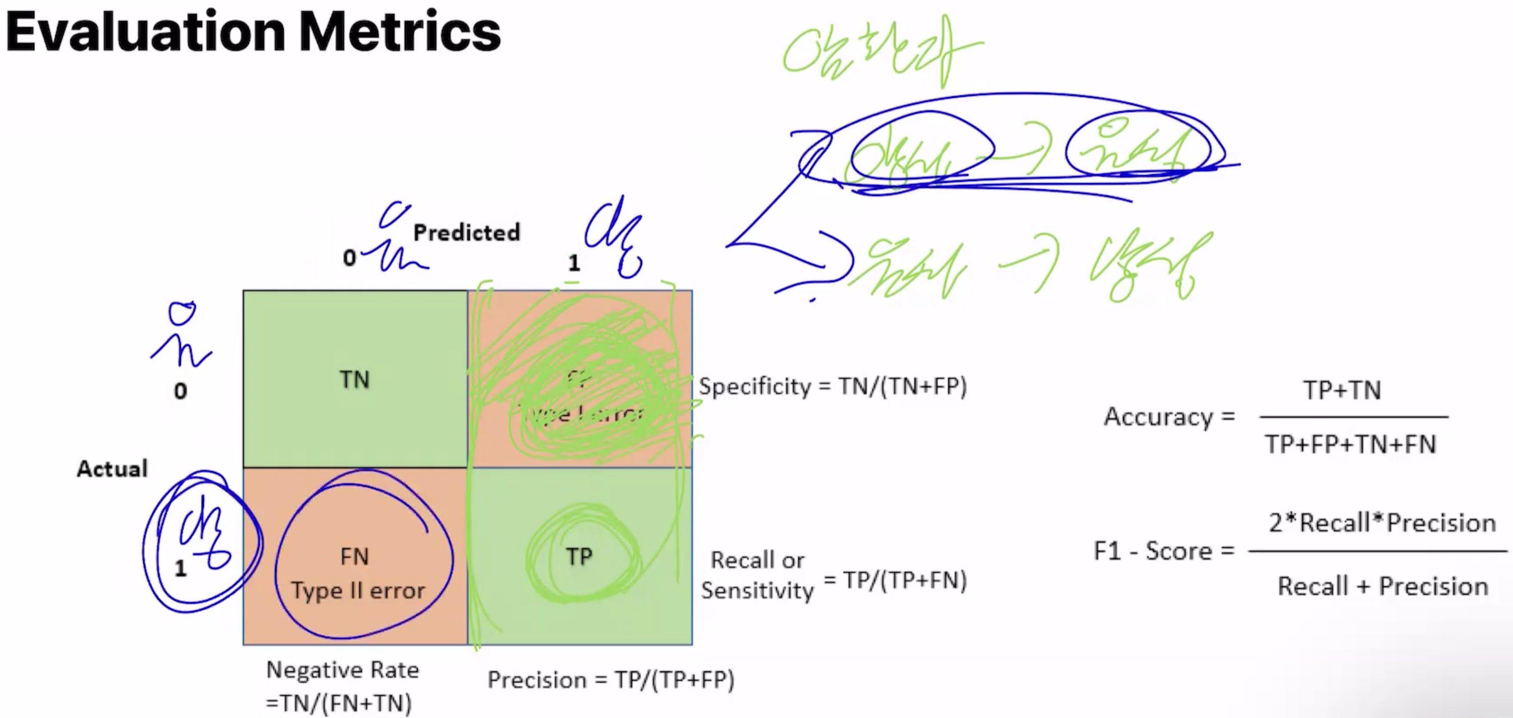 - Evaluation Metrics는 데이터의 불균형때문에 Accuracy만 이야기하는것이 아니다. 예를들면, 10명의 암환자중 음성이 9명, 양성이 1명이 있다고 할때 ai가 무지성으로 10명 모두 음성이라고 한다면 정확도 계산시 90%를 가진 모델이 된다. 사실 이 모델은 제대로 작동하여 맞춘것이 아니라 무지성으로 답한것이기에 이러한 한계점이 있다. 어떤 데이터의 클래스별 분포를 고려하여 evaluation metrics를 설계해야하는데 task에 따라서 중요한 부분이 다르다.
