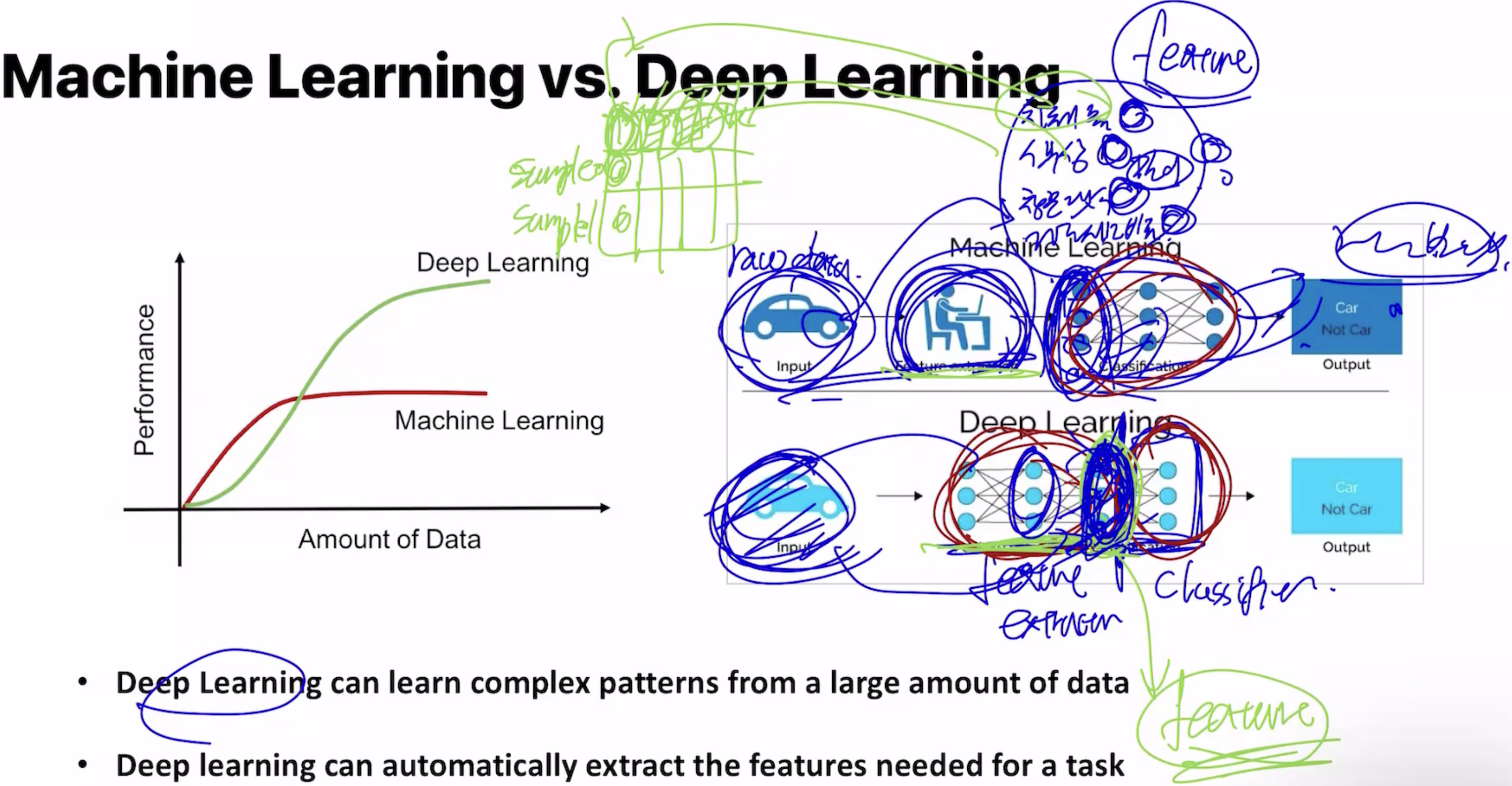 - 딥러닝은 raw data를 많이 넣으면 모델이 알아서 필요한 패턴을 배울 수 있지만 머신러닝은 raw data를 그냥 넣을 순 없기에 기본적으로 어떤 알고리즘을 통해서든 지식을 통해서든 feature를 뽑아내는 과정을 사람이 해야한다. 이것이 머신러닝과 딥러닝을 구분하는 차이중에 하나이다.