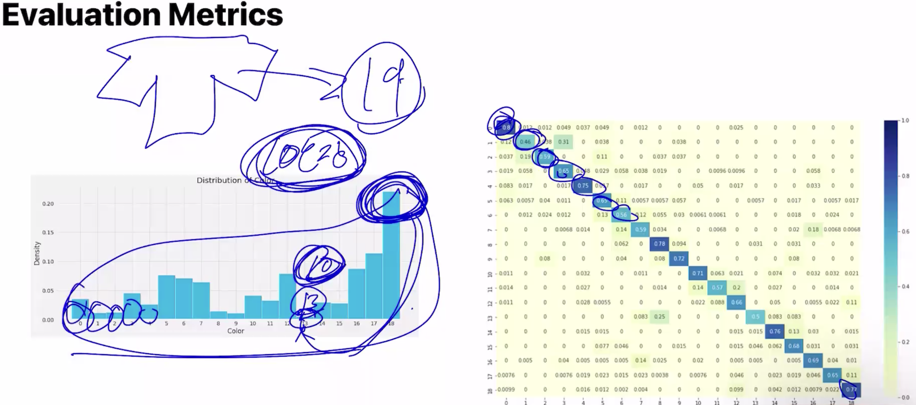 - 위에서 예시를 들었던 암환자 음성양성, 메일의 스펨정상은 binary case인 반면에 위 그림처럼 클래스가 여러개가 있는 상황도 있다. 옷 이미지가 주어지면 색상이 무엇인지 분류하는 것이며 색상은 총 19종류가 있다. 색상마다 분포의 차이가 심한건 몇십배 이상 차이가 있을때 이런상황에서 골고루 잘하는 방법이 무엇인가. 만약 정확도를 찾아서 단순히 다 합쳐서 옷 몇만장 중에 몇 장을 맞췄다고 하면 안된다. 따라서, 모든 옷 종류에 대해서 동일한 가중치를 주고 동일한 중요도를 주고 비교하려면 각각에 대해서 정확도를 재고 그 정확도를 평균을 내는 방식으로 접근할 수 있다.