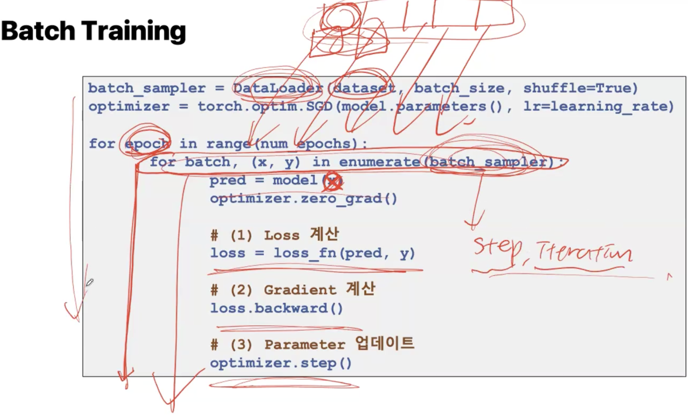- 하나씩 하나씩 가져온 데이터를 집어넣고 로스를 계산하고 역전파를 계산하여 최적화를 해나가는 일련의 과정을 이제 앞으로 많이 보게되는 인공지능의 training 방식이라고 할 수 있다.