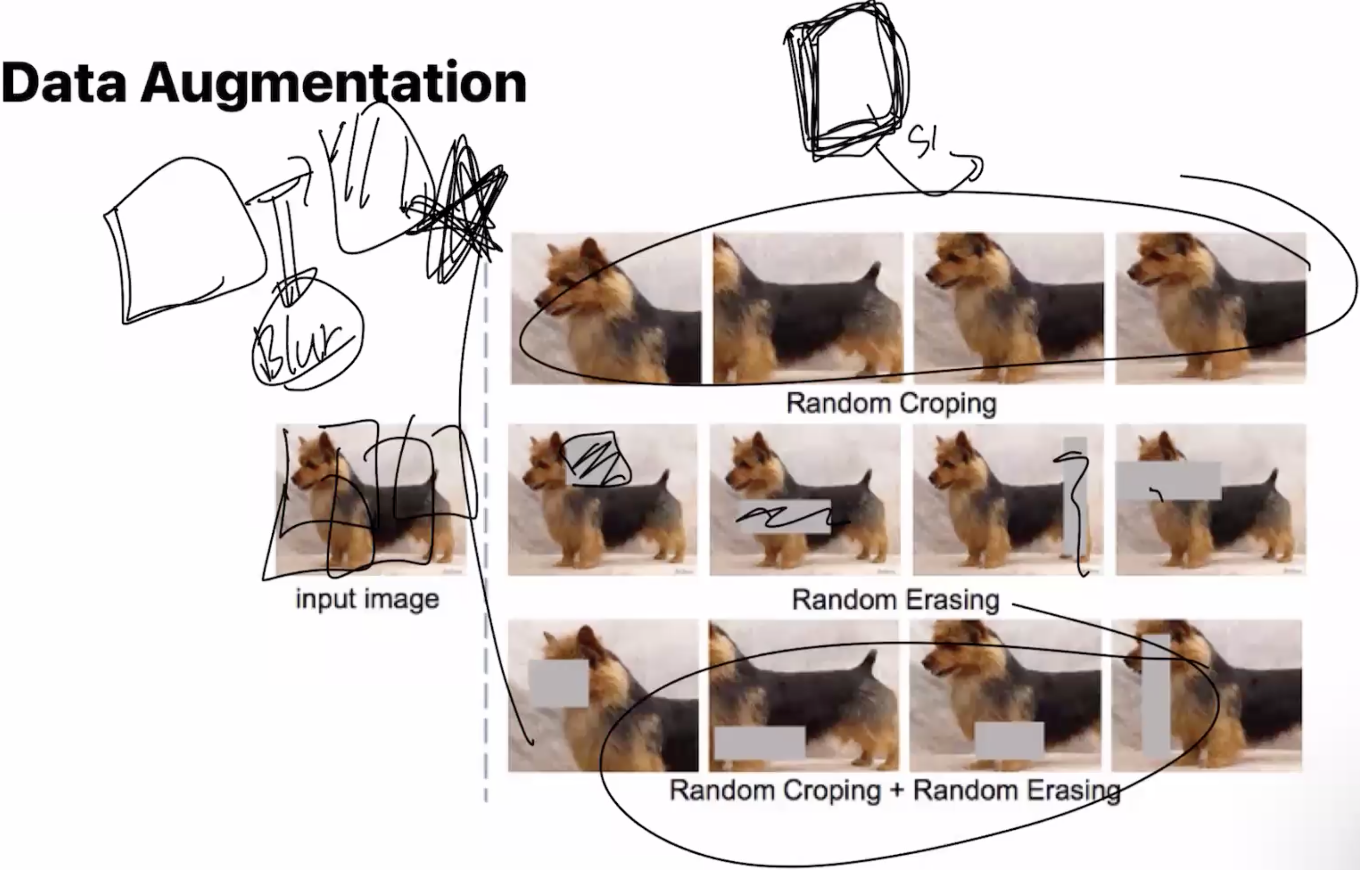 - Random Croping은 랜덤으로 자르는건데 효과가 좋아 경진대회에서도 많이 쓰인다. Random Erasing은 랜덤하게 일부러 지우는거고, 둘 다 쓰는것은 효과적이니까 쓸만하면 좋다.